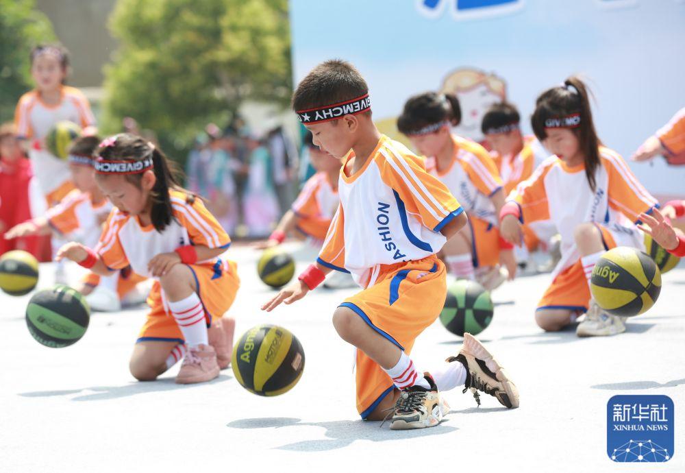5月31日,在江苏省淮安市盱眙县天泉湖镇古城小学,孩子们在进行篮球操表演。新华社发(颜怀峰 摄)