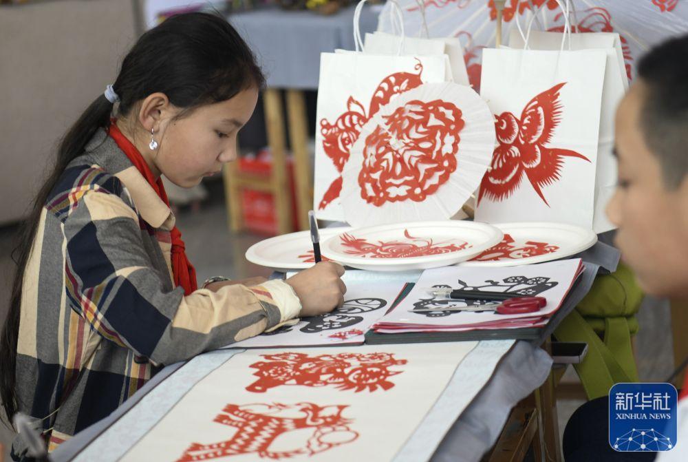 5月31日,在新疆乌鲁木齐县新时代文明实践中心,乌鲁木齐县小渠子中学学生在手工艺展示活动中制作剪纸。