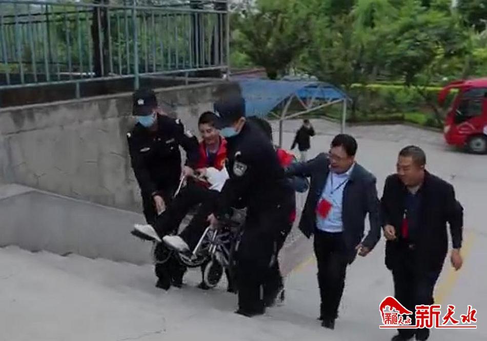 新天水讯【记者蔚军平】6月7日高考第一天,在清水县一中考点发生暖心一幕,一名考生因腿部受伤,无法正常进入考场,清水县公安局执勤民警上门爱心护送,抬着轮椅将考生送进考场,让考生按时顺利参加了考试。