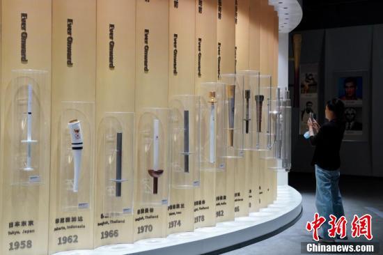 历届亚运会火炬墙吸引参观者驻足拍摄。