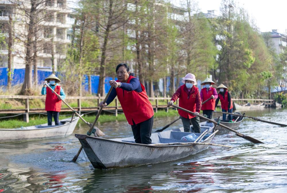 3月20日,李云丽(左二)带领巾帼打捞队队员划船准备到滇池草海开展打捞工作。新华社记者陈欣波 摄