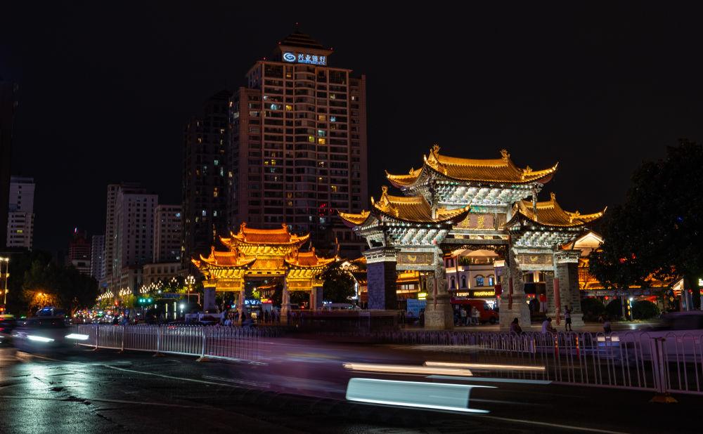 位于昆明市中心的金马碧鸡坊夜景(6月13日摄)。新华社记者江文耀 摄