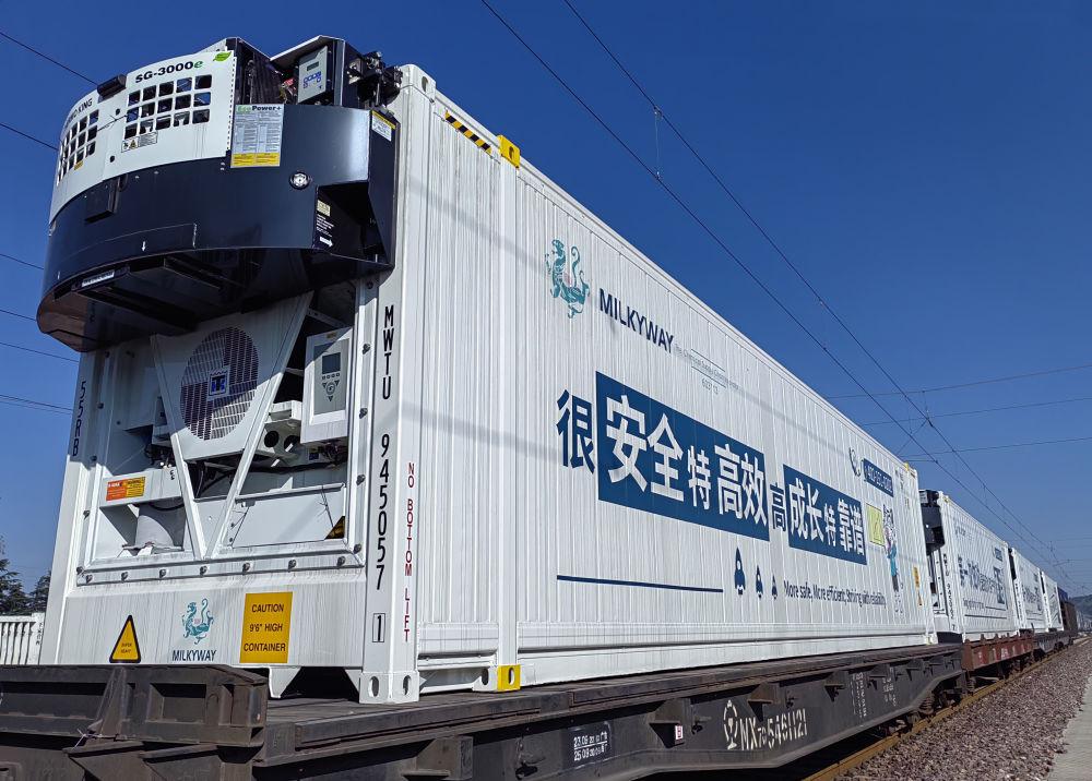 4月19日,装载着来自泰国等地热带水果的冷链集装箱到达昆明东站。新华社发(秦文璐 摄)