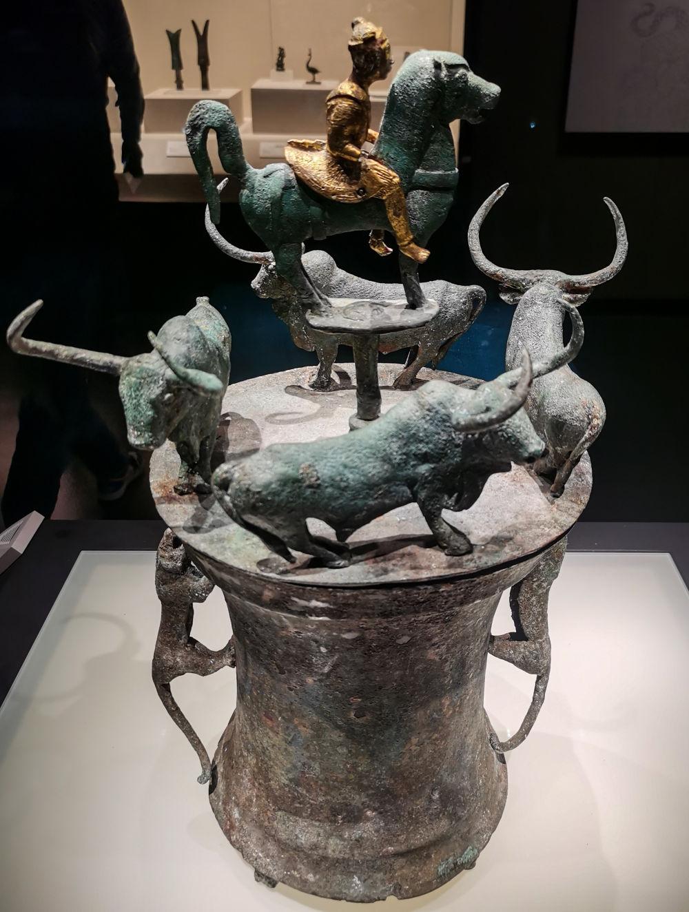 云南省博物馆展陈的四牛鎏金骑士铜贮贝器(3月26日摄)。新华社记者陈冬书 摄