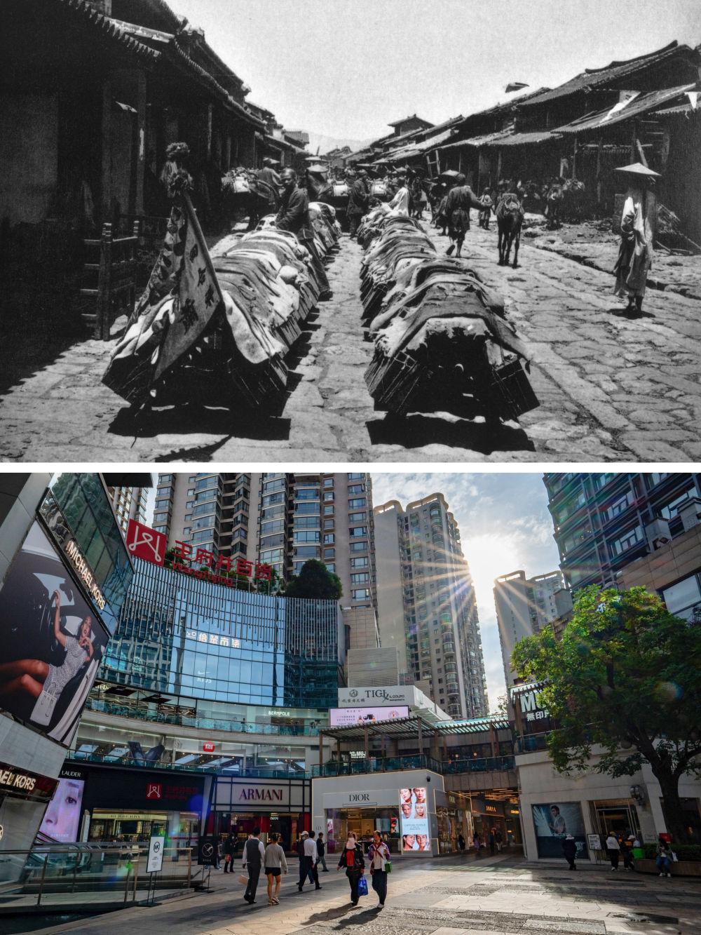 上图为:清末,法国驻华官员方苏雅拍摄的镖局押运马帮在顺城街的照片(资料照片由殷晓俊提供)。下图为:6月15日拍摄的昆明顺城街购物中心景象。新华社记者江文耀 摄