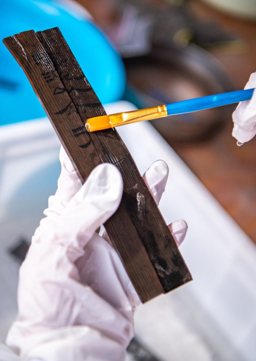 考古工作者在清理云南河泊所遗址出土的简牍(2022年9月21日摄)。新华社记者江文耀 摄