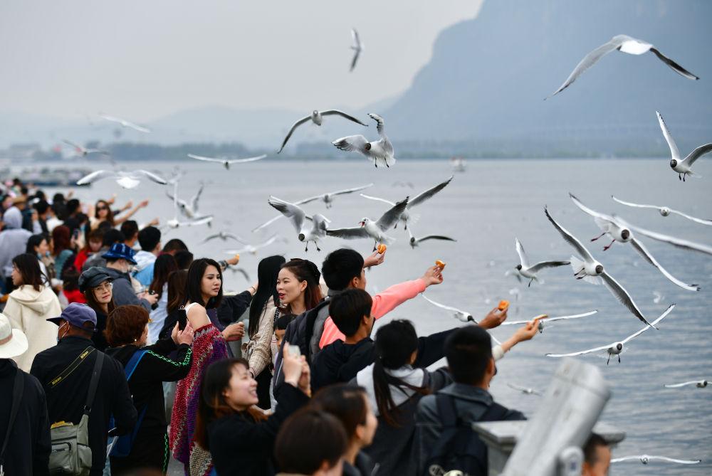 3月12日,游客在昆明海埂大坝喂红嘴鸥。新华社记者陈欣波 摄