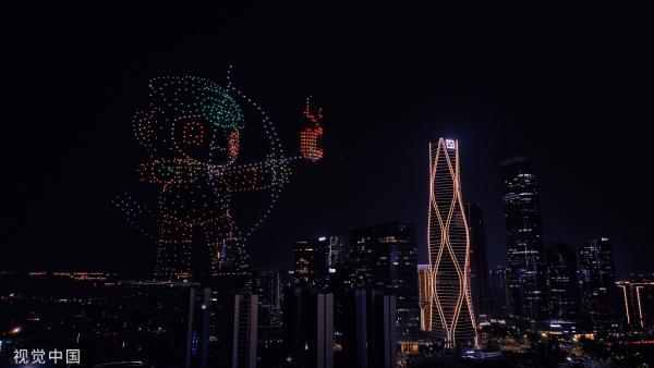 杭州亚运会倒计时100天 杭州大火炬被千架无人机点亮。(视觉中国)
