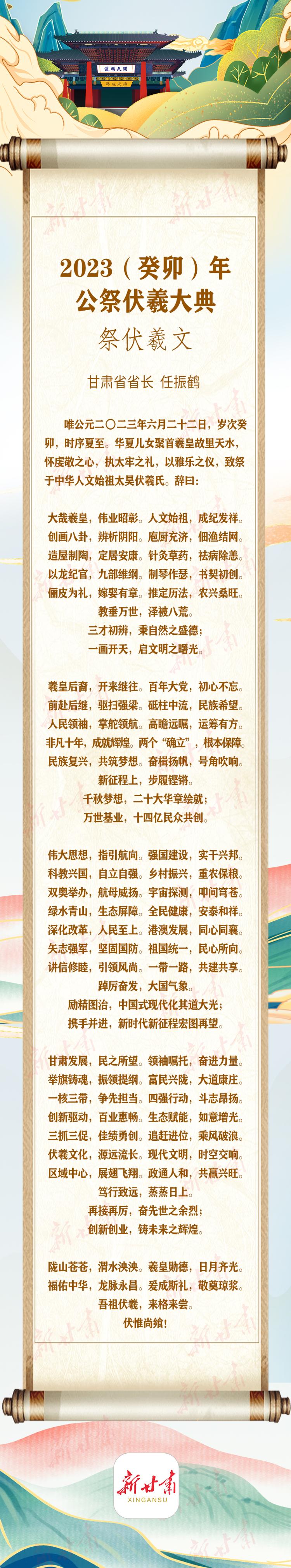 祭文追思太昊伏羲“一画开天,启文明之曙光”功德,颂中华民族只争朝夕、攻坚克难取得的伟大成就,讲述陇原儿女牢记领袖嘱托,全面建设社会主义现代化幸福美好新甘肃的奋进故事。