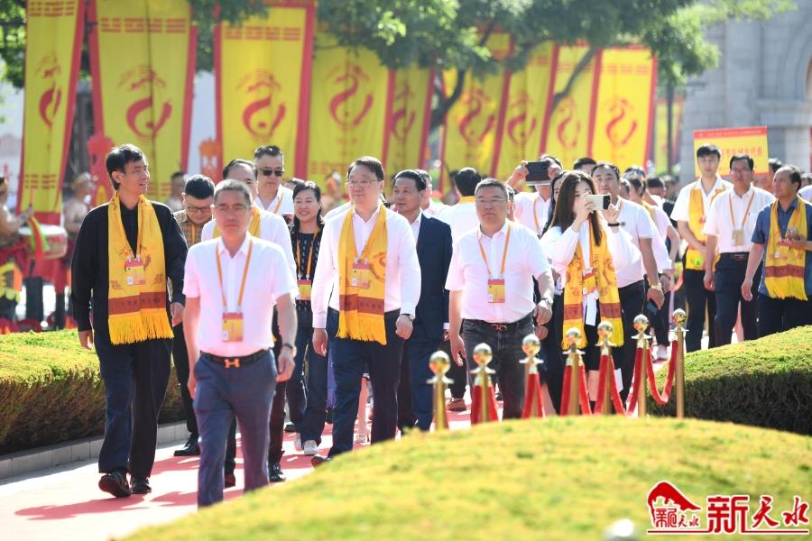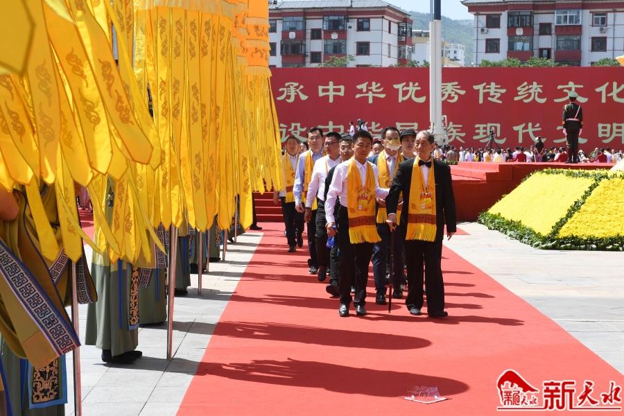 花团锦簇,龙旗飘扬。远道而来的海内外宾朋,身披黄色绶带,怀着虔诚恭敬的心情,缓步走过伏羲广场,静静伫立,共同迎接盛典。