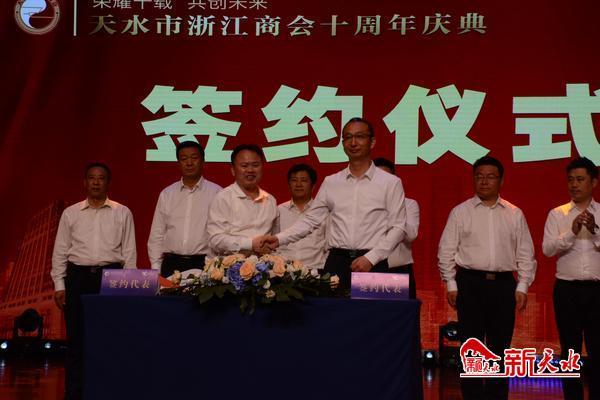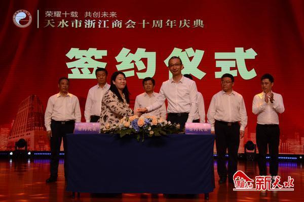 天水市浙江商会十周年庆典既是荣耀的典礼,又是再创辉煌的发端,在庆典现场,天水市政府分别与全国工商联五金机电商会会长企业—亿联集团有限公司、浙商总会亚太机电集团有限公司、陕西省浙江商会会长企业—华鼎建设控股(集团)有限公司、东方希望集团投资部等企业签订了《战略合作框架协议》;甘谷县政府与香港铜锣湾集团签订了《甘谷铜锣湾广场战略合作框架协议》。