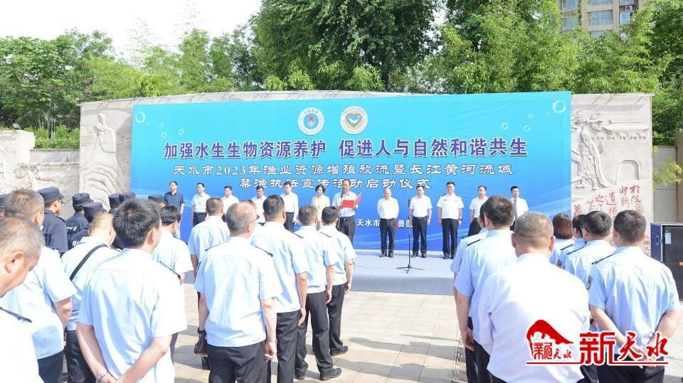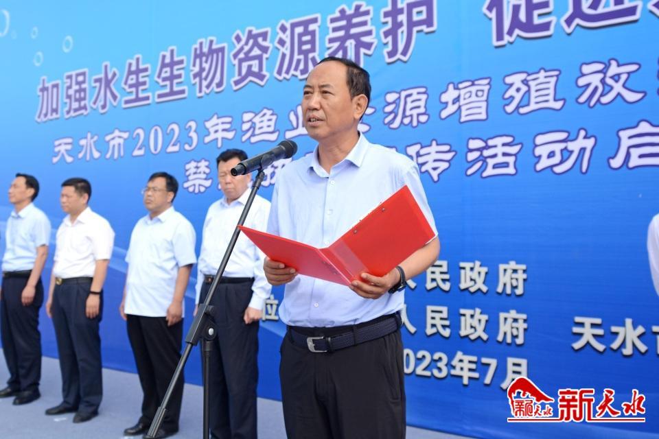 新天水讯【记者孙镇】7月4日,由市政府主办,秦州区政府、市畜牧兽医局承办的天水市2023年渔业增殖放流暨长江黄河流域禁渔执法宣传活动在天水湖文化广场举行。