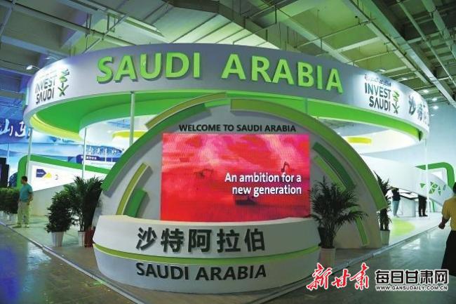 沙特阿拉伯国家馆由甘肃驻沙特阿拉伯商务代表处牵头组织参展,展区设计整体以白绿色为主,体现了阿拉伯民族热爱和平与注重生态环境保护的理念,构架方圆并济,搭建风格清新独特,通过LED屏、灯箱等形式展示沙特阿拉伯国家形象、独特风貌、特色产业及特色产品。参展企业有沙特著名椰枣公司AL KHALALA,富有特色的咖啡公司、丝绸之路公司、阿美、阿吉兰兄弟公司等,参展企业知名度高、特色鲜明。