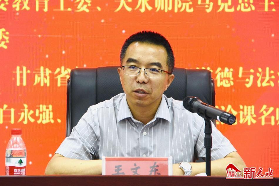 新天水讯【记者童强】7月6日,全市学校“大思政课”建设暨思想政治理论课名师工作室研讨会在天水市第三中学举行。市委常委、宣传部部长王文东出席会议并讲话,市委教育工委及天水师院马克思主义学院负责人出席会议。