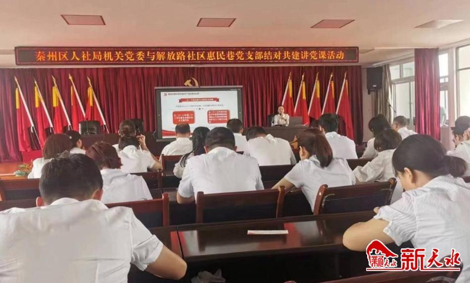 新天水讯 近日,秦州区人社局机关党支部、资金中心党支部、公共就业和人才中心党支部,与解放路社区惠民巷党支部开展“联合共建,同上党课”活动,特邀秦州区委党校裴志娟讲师以《领航新时代,奋进新征程》为题,为党员们上了一堂生动的党课。