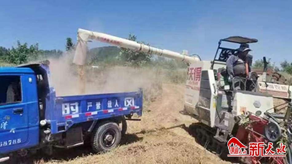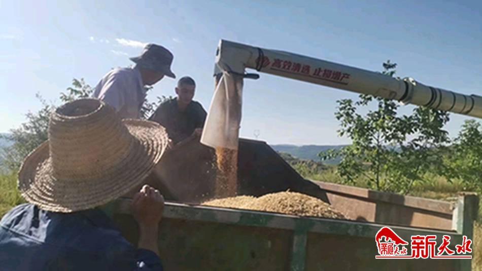 新天水讯 繁忙的7月,夏收在清水县黄门镇的土地上如火如荼地进行着,收割机在这片金色的大地上来回穿梭,隆隆机声和着人们的欢笑声此起彼伏,与远处的蓝天白云构成了一幅风吹麦浪、物阜民丰的好“丰”景。在黄门镇小河村200亩小麦良种繁育基地示范点上,收割机在麦田里穿梭,将麦穗“吞进肚中”,一股股麦流从出粮口倾斜而下,饱满的麦粒顺着管道不断落入车厢内,忙活的农民脸上洋溢着丰收的喜悦。