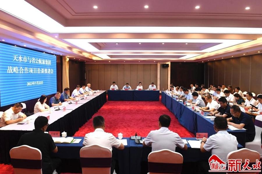 新天水讯【记者 马放】7月22日下午,天水市与省公航旅集团举行战略合作项目洽谈推进会,双方就进一步深化地企合作、促进发展共赢进行座谈协商。市委书记冯文戈主持会议并讲话,省公航旅集团党委书记、董事长石培荣,市委副书记、市长王国先出席会议并讲话。市委常委、常务副市长贾义翔,副市长董小平,省公航旅集团副总经理乔小兵、孙进玲、史光磊等参加会议。