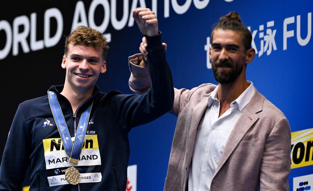 7月23日,法国选手马尔尚 (左)和美国名将菲尔普斯在颁奖仪式上合影留念。新华社记者 夏一方 摄