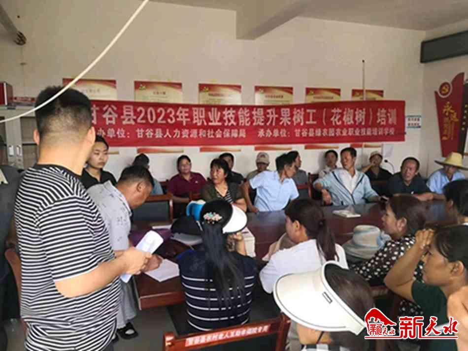 新天水讯 为切实抓好花椒树综合管护工作,提高农户种植技术,近日,甘谷县人社局、绿农园农业职业技术培训学校在谢家湾乡联合组织开展了“甘谷县2023年职业技能提升果树(花椒树)培训”活动,各村负责人及各村花椒种植大户参加了此次培训。