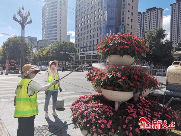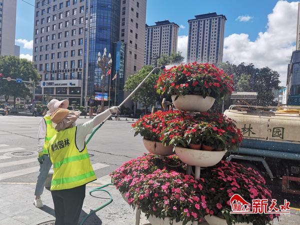 7月29日,天水高温天气持续,在秦州区民主路,园林工人为花草树木浇水“解渴”,确保植物安全度夏。由于近期天气持续晴热,植物蒸腾失水量大,如不及时补水,植物会因缺水萎蔫,甚至枯死,我市园林工人全力做好园林绿化养护工作,持续巩固城区绿化景观效果。新天水记者余碧波 摄