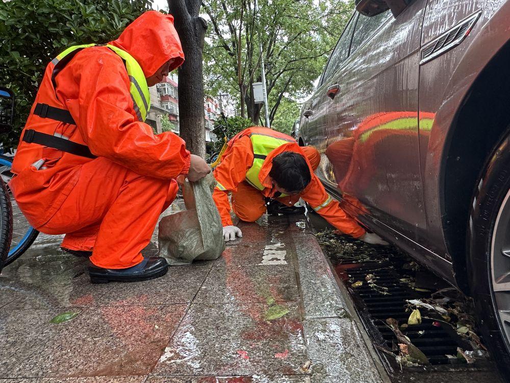 图为7月31日,邵松松与同事清掏雨水篦子。新华社记者 田晨旭 摄