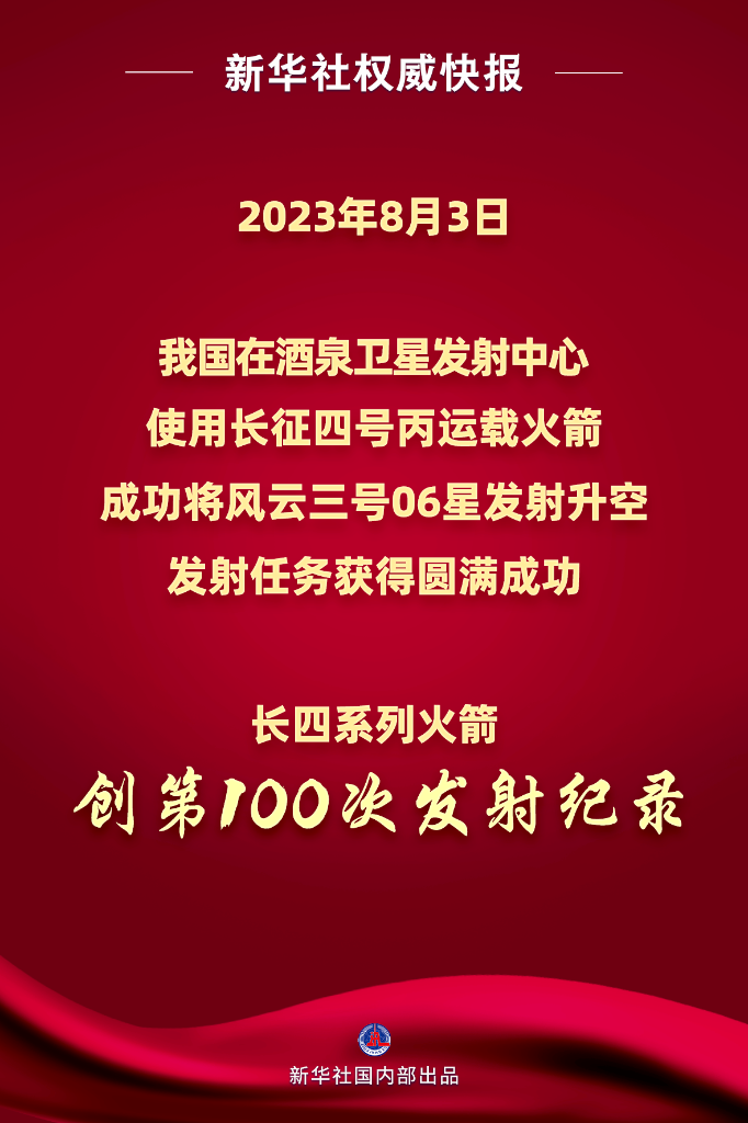 2023年8月3日11时47分,我国在酒泉卫星发射中心使用长征四号丙运载火箭,成功将风云三号06星发射升空,卫星顺利进入预定轨道,发射任务获得圆满成功。