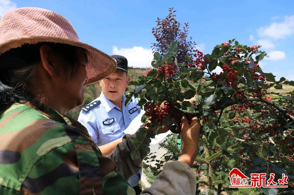 新天水讯 火红的八月,椒红似火,甘谷县22万亩花椒进入采摘期,其中六峰镇花椒种植面积达4.3万亩。甘谷县公安局六峰派出所民辅警深入田间地头,利用花椒采摘季开展交通安全和反诈宣传,提高农民群众的交通安全意识和反诈能力,筑牢农村道路交通安全防线守护群众“钱袋子”,护航当地经济高质量发展。