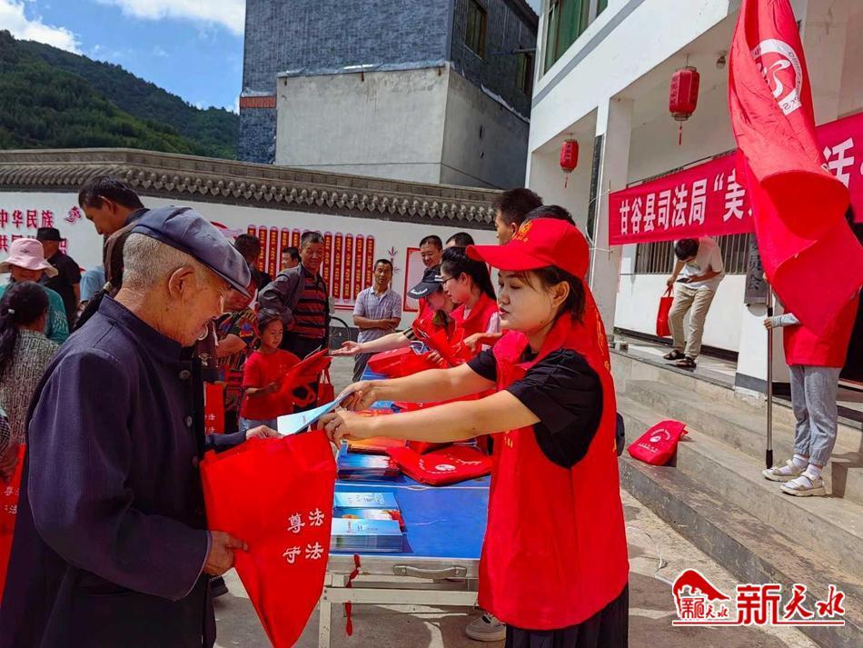 新天水讯 8月4日,甘谷县司法局组织普法志愿者到古坡镇上店子村开展“法律进乡村”普法宣传活动,以实际行动扎实推进法治乡村建设。