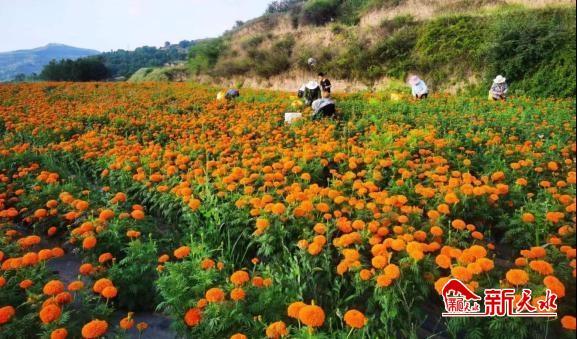 今年,上袁村采取“党支部+合作社+基地+农户”的模式,充分发挥镇村党组织统筹资源优势,瞄准市场需求,因地制宜,由村股份经济合作社牵头,结合撂荒地整治承包村里闲置土地,在西山一组种植万寿菊70余亩。万寿菊花期长达4个月,可采摘到10月,最少能采摘四茬,第一茬采收已接近尾声,四茬采摘亩产量预计达到3000斤,经济效益明显。