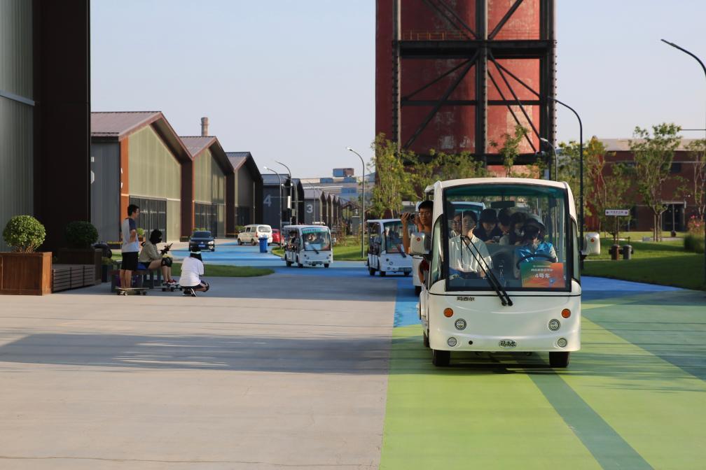 8月13日,媒体记者在首钢园区乘车参加场馆探营活动。新华社记者 孙玮彤 摄