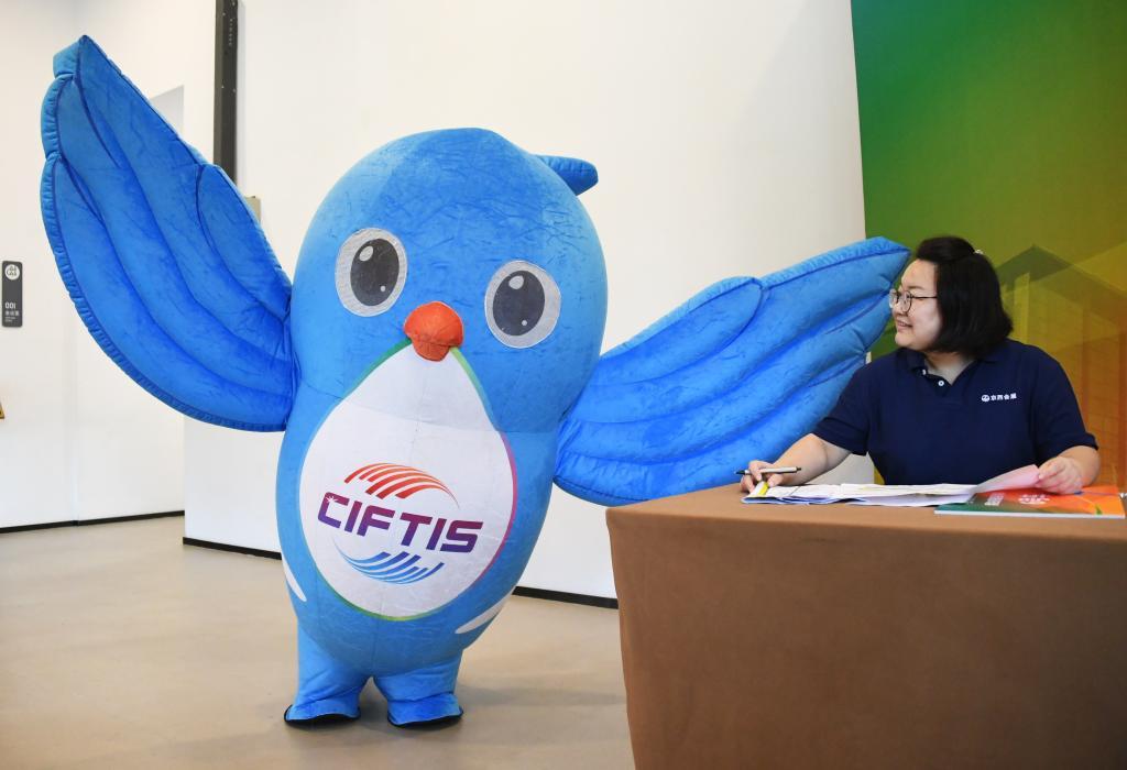 8月13日在2023年服贸会“我在服贸会等你”新闻发布会现场拍摄的吉祥物“福燕”。新华社记者 任超 摄