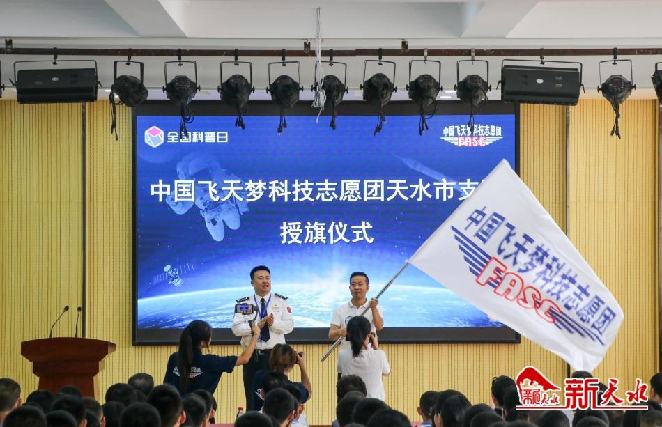 活动中,播放了“中国飞天梦—科普万里行”纪录片,中国飞天梦科技志愿团负责人向天水市支队进行授旗,本届活动中国飞天梦科技志愿团、中国教育发展基金会,还邀请新东方科技教育集团,联合我市科协对我市的1所学校进行物资捐赠。