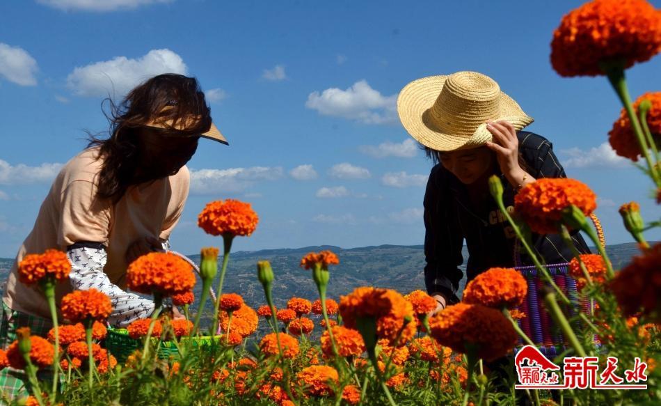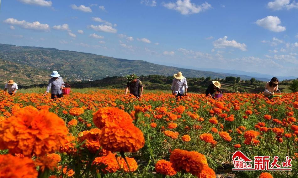 8月14日,麦积区石佛镇张湾村老牛湾区域的山梁上,金灿灿的万寿菊竞相绽放,花浪如海;花农手挽竹篮,穿梭在花海中采摘“幸福花”。