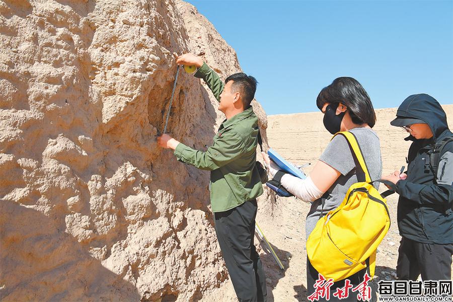 ▲嘉峪关丝路(长城)文化研究院长城保护研究所工作人员在“长城第一墩”进行本体病害调查。新甘肃·甘肃日报记者冯乐凯