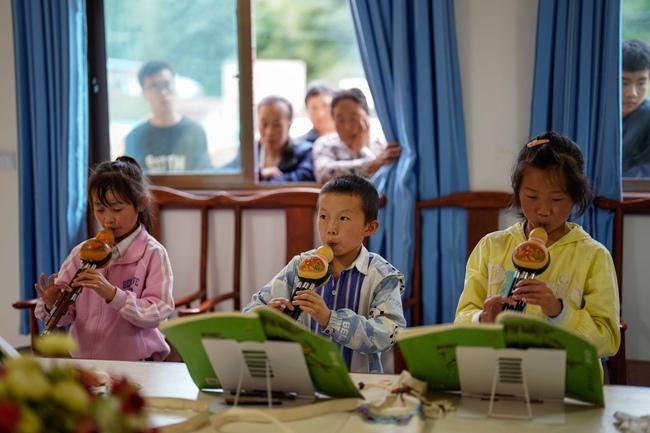 定西市陇西县桦林村“桦之韵”葫芦丝学习班上,孩子们正在练习葫芦丝。甘肃省总工会供图