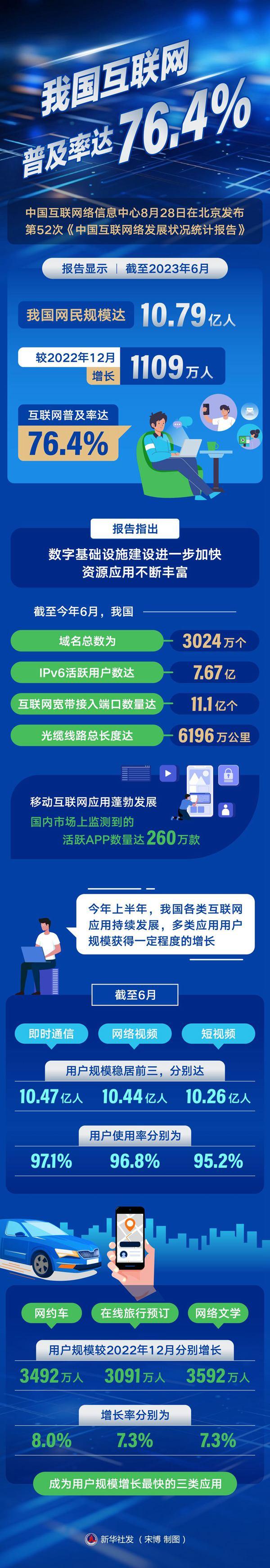 新华社北京8月28日电(记者王思北)中国互联网络信息中心28日在京发布第52次《中国互联网络发展状况统计报告》。报告显示,截至2023年6月,我国网民规模达10.79亿人,较2022年12月增长1109万人,互联网普及率达76.4%。