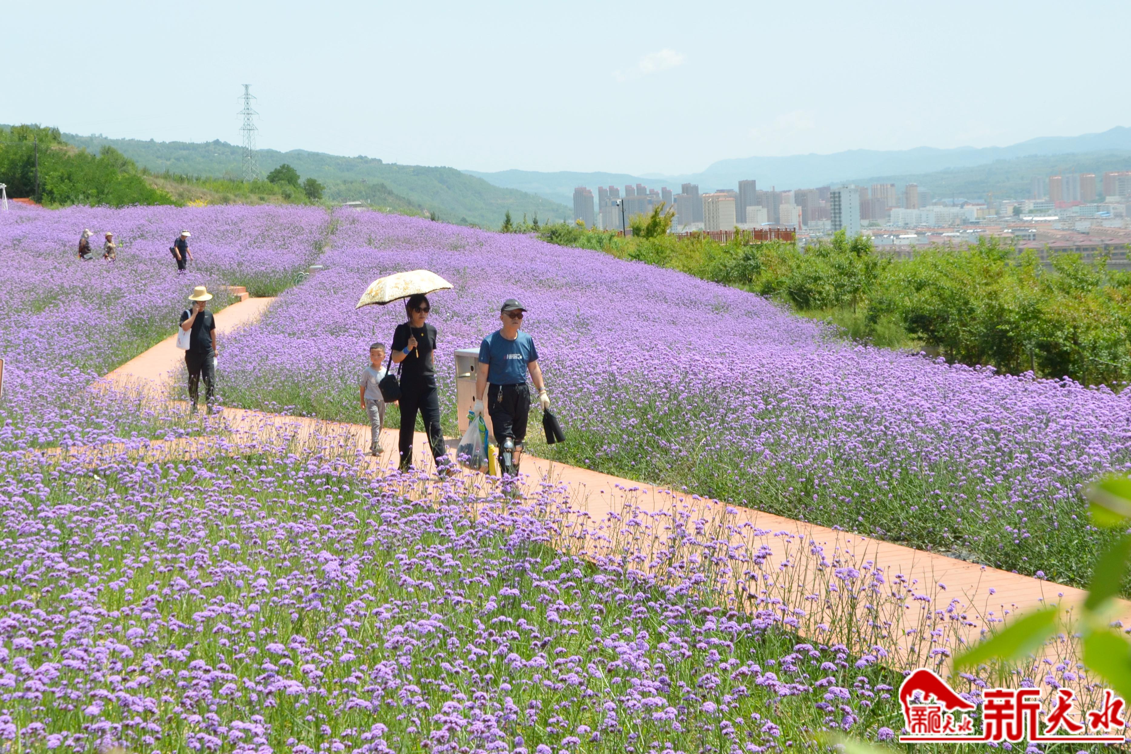 新天水讯【记者王琴】8月25日,清水县花舞北山文旅农康融合发展示范基地花海如潮,在秋日阳光的照耀下,马鞭草紫色的花朵汇聚成一片紫色花海,随着山间微风徐徐摇曳,飘飘袅袅,好似不小心打翻的颜料盘,在山坡上渲染开来。这美丽的景色也吸引了众多游客前来打卡,享受美好秋日时光。
