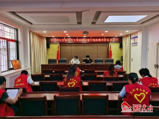 新天水讯【记者马海林】为倡导婚嫁新风,让青年树立正确的婚恋观、家庭观,8月29日,秦州区中城街道办伊民巷社区新时代文明实践站组织志愿者和适龄未婚青年,开展了移风易俗倡新座谈会,进一步引导广大群众树立婚嫁新理念,并签订了“抵制高价彩礼承诺书”。