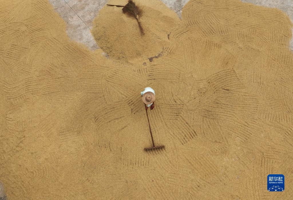 8月27日,在湖南省衡阳市石鼓区角山镇,当地村民在晾晒稻谷(无人机照片)。初秋时节,各地农民利用晴好天气忙着收获稻谷等,到处是一派繁忙的景象。新华社发(曹正平 摄)