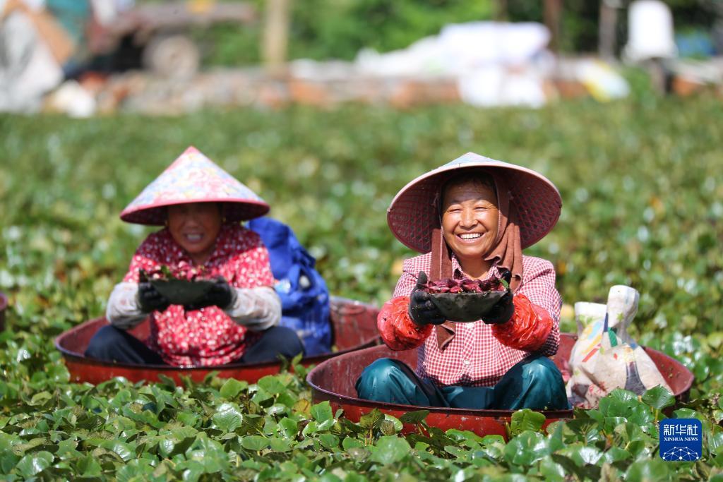 8月24日,浙江省温岭市箬横镇双透村农民在运送刚采摘的菱角。眼下,各地菱角陆续进入采摘期,农民加紧采摘,确保新鲜的菱角及时供应市场。新华社发(周学军摄)