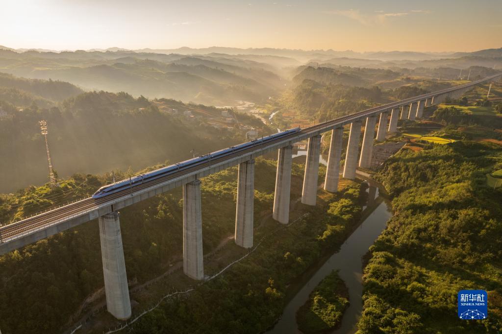 8月31日,一列动车组在晨曦中经过位于贵州省独山县郊外的贵南高铁银坡河特大桥(无人机照片)。新华社记者 刘续 摄