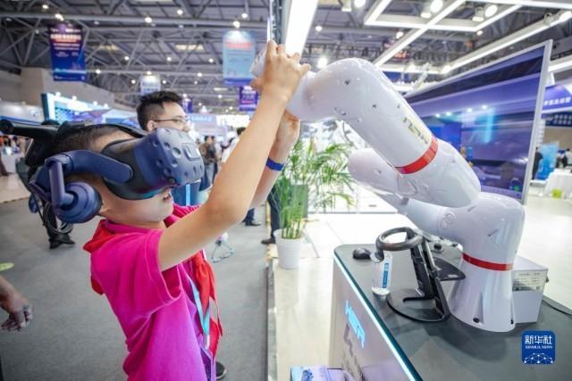 9月4日,在2023智博会华数机器人展厅,观众体验工业协作机器人。