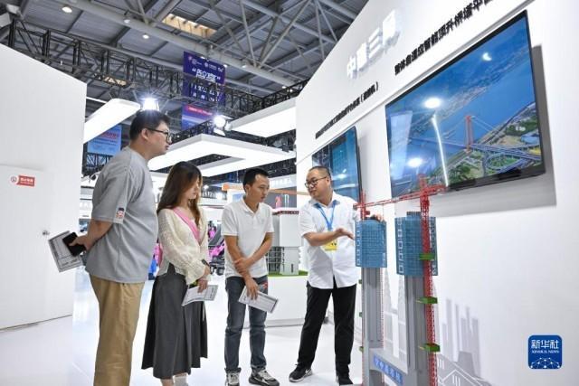 9月4日,观众在智博会上参观中建三局展示的空中造塔机。