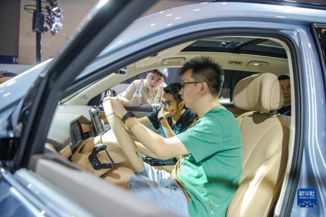 9月4日,观众在2023智博会“智能驾舱”展区参观、体验。
