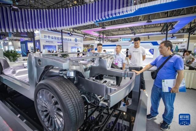 9月4日,观众在2023智博会“电驱、电转向、电制动”展区参观。