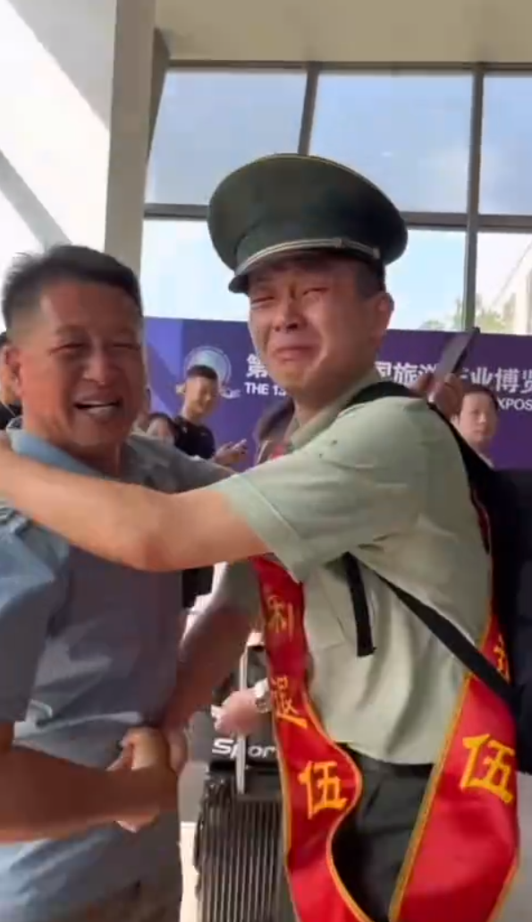 赶来车站接退役儿子回家