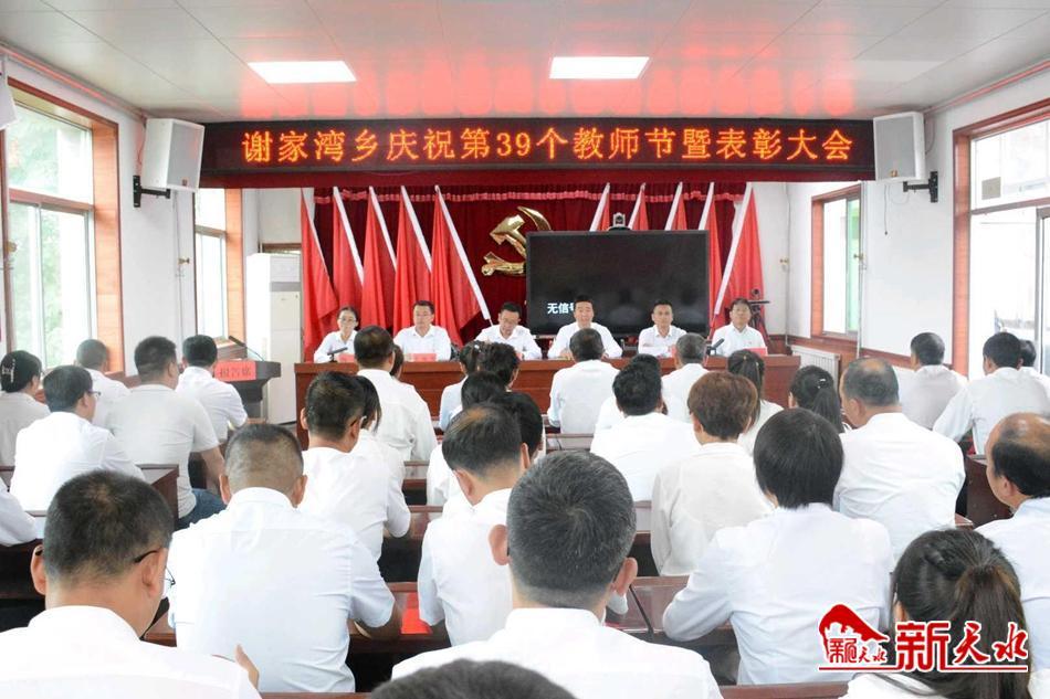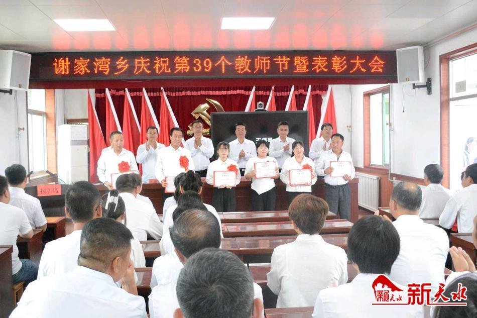 新天水讯 9月6日,甘谷县谢家湾乡隆重召开庆祝第39个教师节暨表彰大会,向受到表彰的2个先进集体和49名先进个人分别颁发了奖牌和荣誉证书,先进集体、获奖教师、新入职教师代表分别发言。