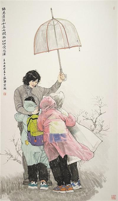 现实中,有许多优秀教师以大爱之心育莘莘学子,他们的精神令人动容。一些美术工作者攫取其中典型,进行艺术提炼,展现人民教师以心灵唤醒心灵、以精神引领精神、以生命温暖生命的高尚品格。譬如,桑建国中国画《春雨》,用细致的工笔语言、柔和明朗的色调,描绘了一名女教师在雨中为学生们撑伞的场景。3名学生紧紧抱住老师,老师则将小小雨伞向学生倾斜,全然不顾自己已置身雨中。此时,伞下的空间仿若一处温馨的港湾,为学生带来满满安全感,正如画家在题跋中所言,“师恩深深如春雨,润物细细爱之深”。周思旻雕塑《最美女教师——张丽莉》则以“见义勇为最美人物”张丽莉为表现对象。2012年,在一场车祸中,张丽莉为救学生而失去双腿。作品呈现了她坐在轮椅上被学生环绕的情景。学生们的表情充满关切又略带凝重,张丽莉则面露微笑。古典唯美的人物塑造,表现出一位人民教师的生动形象。