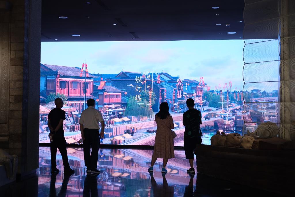 图为观众在超高清大屏幕前,随着漕船的视角“一路北上”,“抵达”通州。秦宇杭 摄