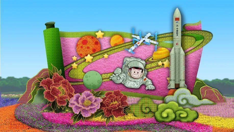 复兴门东北角“筑梦未来”花坛顶高8.5米,以中国航天员、空间站为主景,寓意航天强国建设蓬勃发展,助力中国梦早日实现,全面推进中华民族伟大复兴,谱写新时代中国特色社会主义更加绚丽的华章。